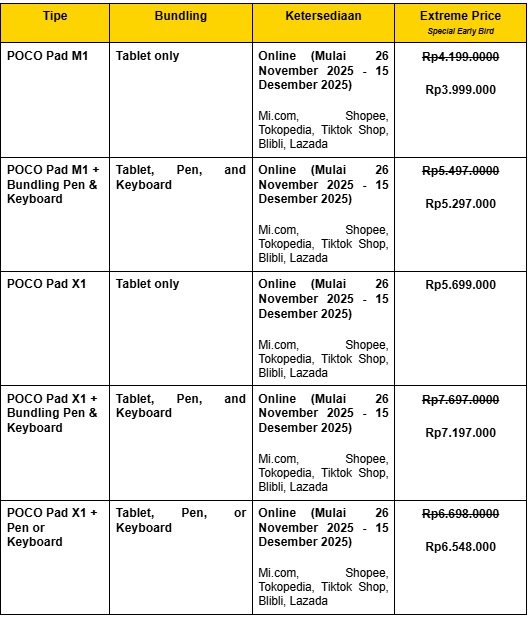 Untuk pasar Indonesia, POCO memberikan penawaran selama 26 November hingga 15 Desember 2025. POCO Pad M1 tersedia dengan harga early bird Rp3.999.000.