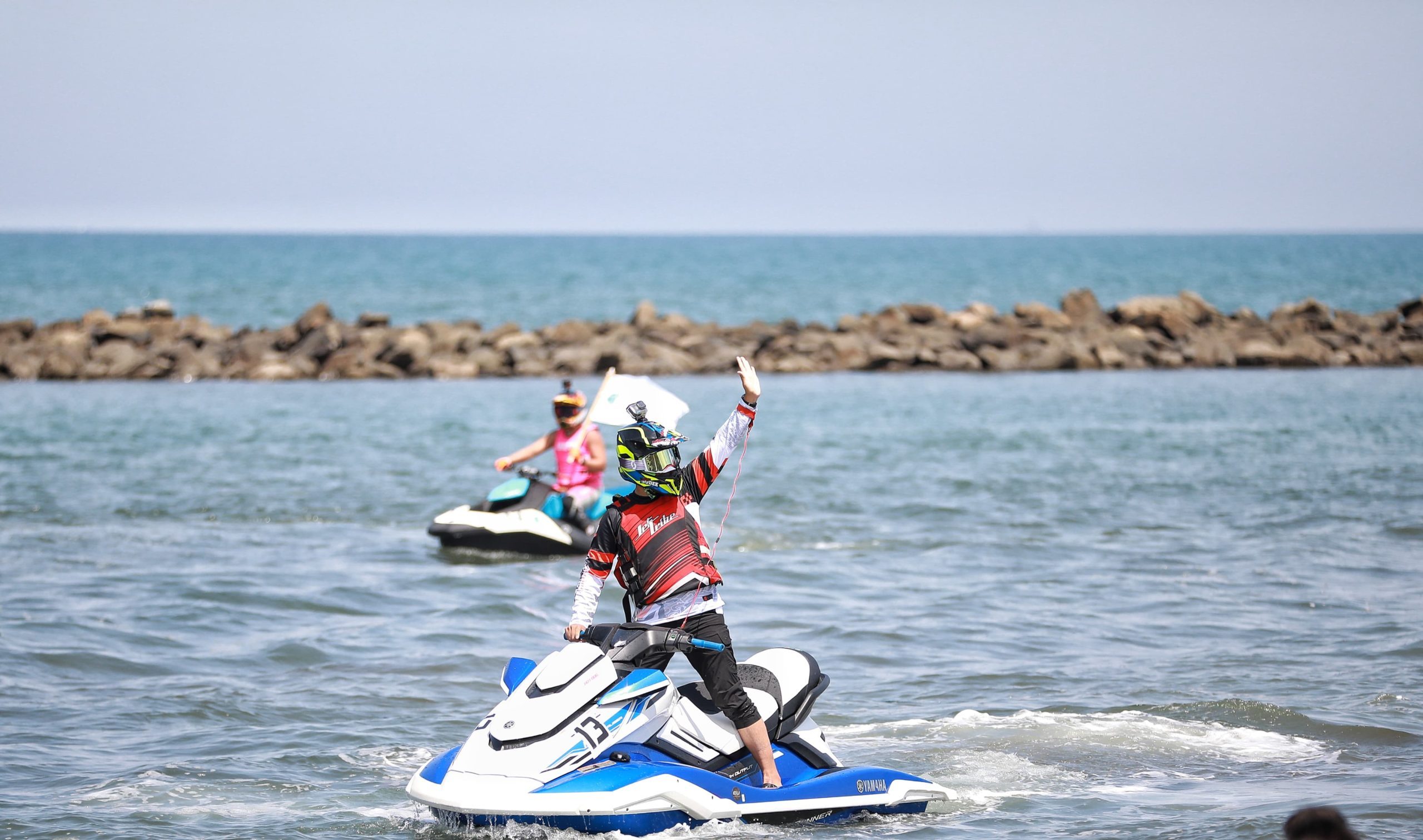 Bersama Anggota DPRD Sulsel Edward Horas, Anggota DPRD Makassar Erik Horas serta para rider, Andi Arwin Azis melepas kerinduan dengan menyempatkan memacu jetski di antara ombak Pantai Biru.