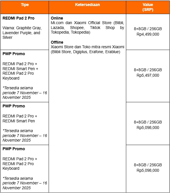 REDMI Pad 2 Pro mulai dijual di Indonesia pada 7 November 2025 ini melalui mi.com dan kanal penjualan resmi Xiaomi Indonesia, baik secara online termasuk di Blibli, Lazada, Shopee, Tiktok Shop by Tokopedia, dan Tokopedia, juga di kanal offline seperti Xiaomi Store, Blibli Store, Digiplus, Erafone, dan Erablue.